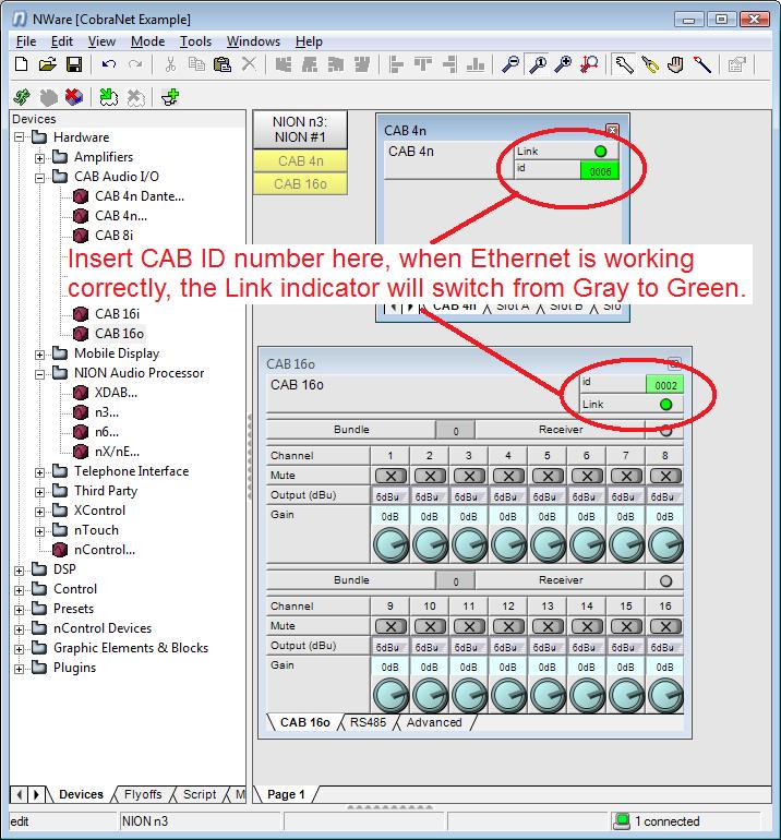 After the project has been deployed, you may now start configuring the CobraNet. I prefer to set up the CAB devices first. Open the CAB 4n object and in the green box enter the Device ID number that is displayed on the front panel of the hardware. (for information about how to set the hardware ID of the CAB 4n, please see "Setting the Hardware ID" section of the CAB 4n Hardware Manual.) Then open the CAB 16o device and set the hardware ID of that unit. (The hardware ID of the CAB 16o is set by some rotary switches under the removable panel on the front of the CAB 16o. If you have already done the CAB 4n, you will be familiar with how this works.) Please see attachment #2 below.