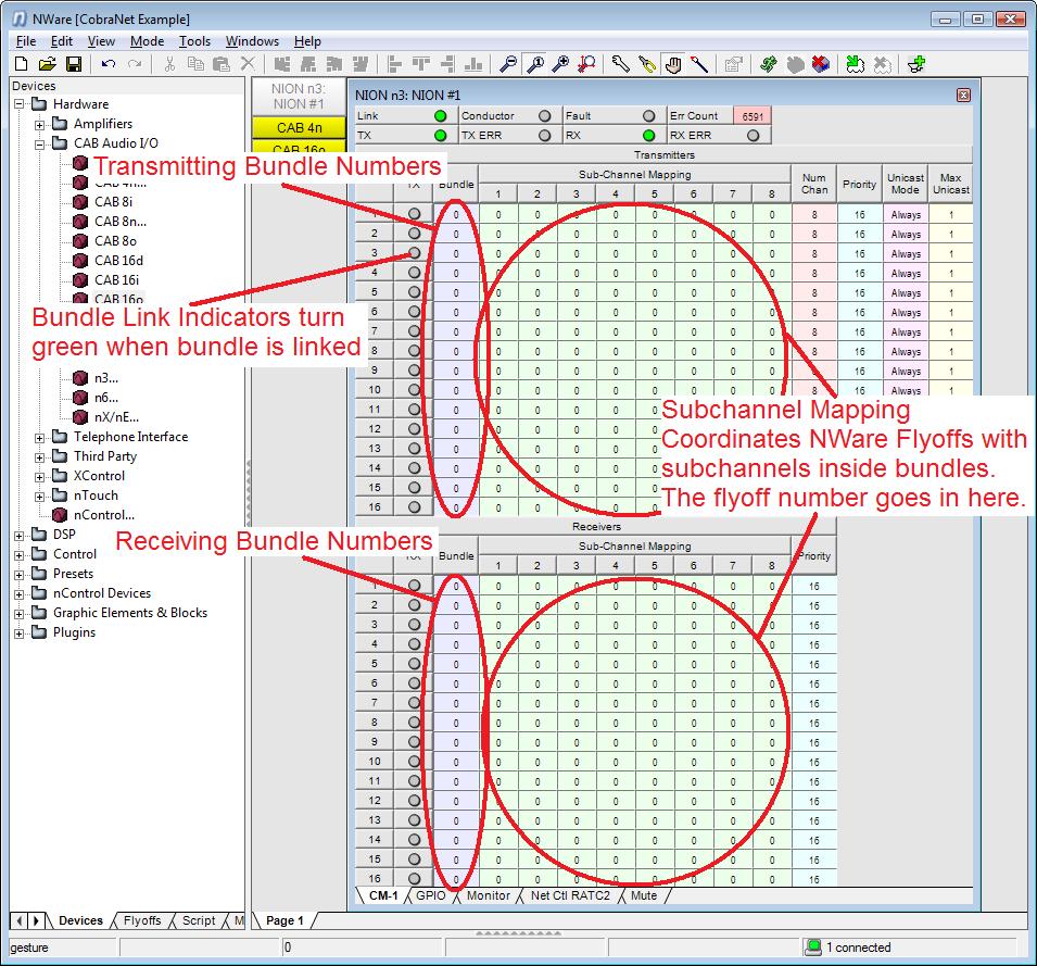 After setting up the bundles in the CAB's, we can now move to the CM-1 page in the NION device to configure the other end of the links. Please see attachment #4 below: 4. NIONAdvancedCobraNetOrientation.jpg at this time for an orientation to the Advanced CobraNet page in the NION. The Violet column on the left is where the bundle number goes. You may note that at the top is the transmitting section and the bottom is the receiving section. There are 16 transmitters and 16 receivers in the NION. The gray indicators to the left of the bundle number field will switch to green when the bundle is connected. The green field in the middle is where the actual bundle subchannel is mapped to a flyoff in NWare. This is where the actual audio channel assignment takes place.